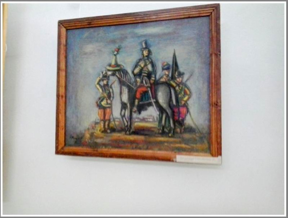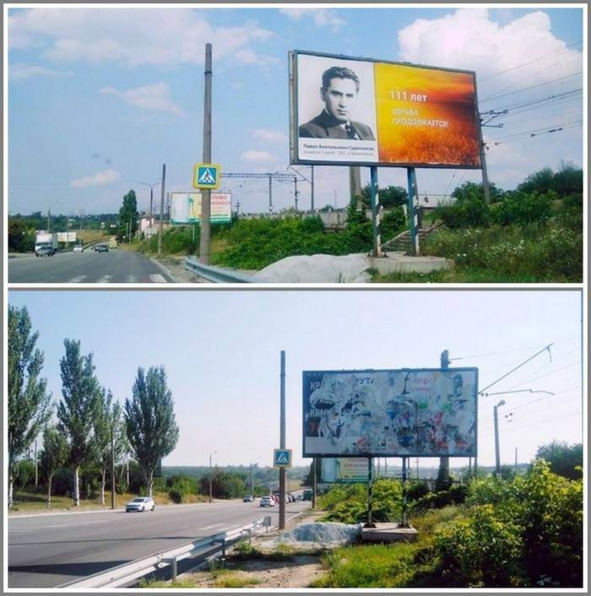 На нем изображены три защитника Украины: козак, полковник армии Украинской Народной Республики Петр Болбочан [его дивизия в 1918 году провела успешный крымский поход и установила в Севастополе флаг Украины] и боец современной украинской армии, который противостоит российской агрессии.