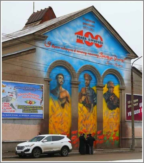 На здании Запорожского областного театра кукол в честь 100-летия Украинской революции открыли мурал единства поколений защитников нашего государства.