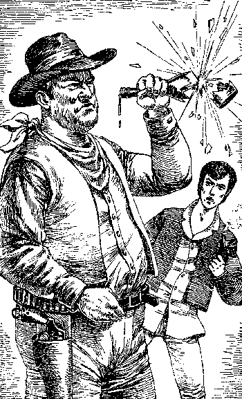 Ресторацию мы находим действительно в двух шагах на главной улице. Над широким крыльцом висит петух, вычеканенный из меди, тускло-золотистый в лучах солнца. На крыльце лежат два детины, лица у них прикрыты ковбойскими шляпами. Их можно принять за мертвецов, но они только мертвецки пьяны. Мы осторожно обходим лежащих и, толкнув дверь, попадаем в длинный полутемный зал. Здесь полтора десятка столиков и стойка, обитая жестью. Столы почти все пусты, за исключением двух-трех, за которыми сидят парни, обросшие колючей щетиной или уже отрастившие лохматые бороды, и пьют что-то темное — виски или пиво. На нас они не обращают никакого внимания. Мы на них тоже. Не спеша подходим к стойке, где протирает бокалы далеким от чистоты полотенцем лысый старик с недобрыми глазами.