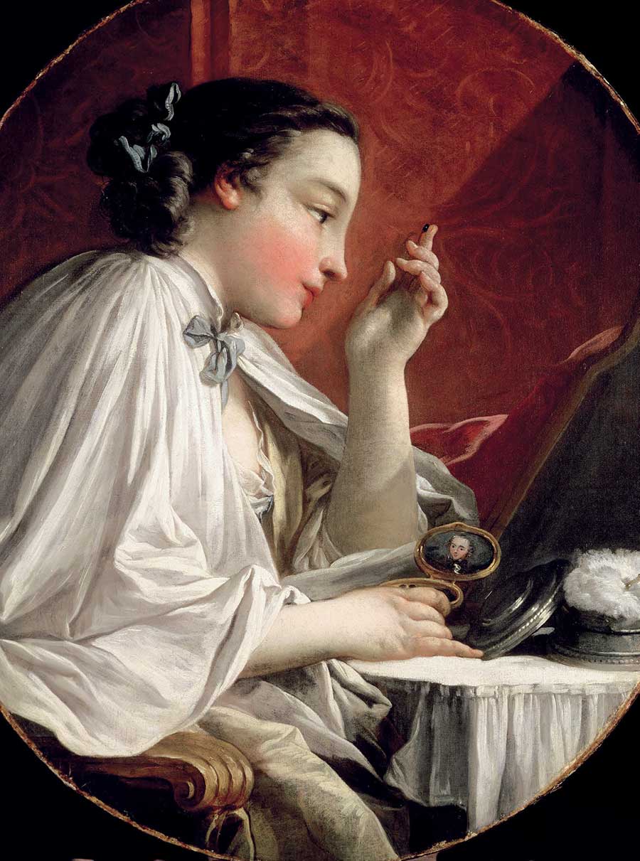 Середина XVIII века в Европе отмечена усиленным использованием румян. Идеал красоты, который мы видим на портретах того времени, – бледное лицо с розовыми щеками (аналогично моде шестнадцатого века) и темными очерченными бровями. С помощью макияжа подчеркивался статус и демонстрировалась причастность к модным веяниям. Румяна наносились так щедро, что каждому очевидно – цель выглядеть естественно не преследовалась. Особенно это касается Франции, которая к этому моменту получает статус законодательницы моды для всей Европы. Придворный этикет французского двора подразумевает раскрашивание лица. Хотя основная часть работы по «наведению марафета» происходит за закрытыми дверями, нанесение макияжа и облачение в платье становится частью публичного представления под условным названием «утро аристократки» (примерно так же сегодня делаются съемки за кулисами модных съемок – то, что называют «бэкстейдж»). Маркиза де Помпадур, фаворитка французского короля Людовика XV, знаменита многочисленными портретами, где она изображается с явно нарумяненными щеками. Ее усилия не пропали даром: один из оттенков розового ныне известен как «розовый Помпадур». На портрете Франсуа Буше 1758 года она изображена у туалетного столика за нанесением румян миниатюрной кисточкой из небольшой пудреницы – редкий случай, когда искусство косметической живописи запечатлено в произведении искусства живописи художественной.