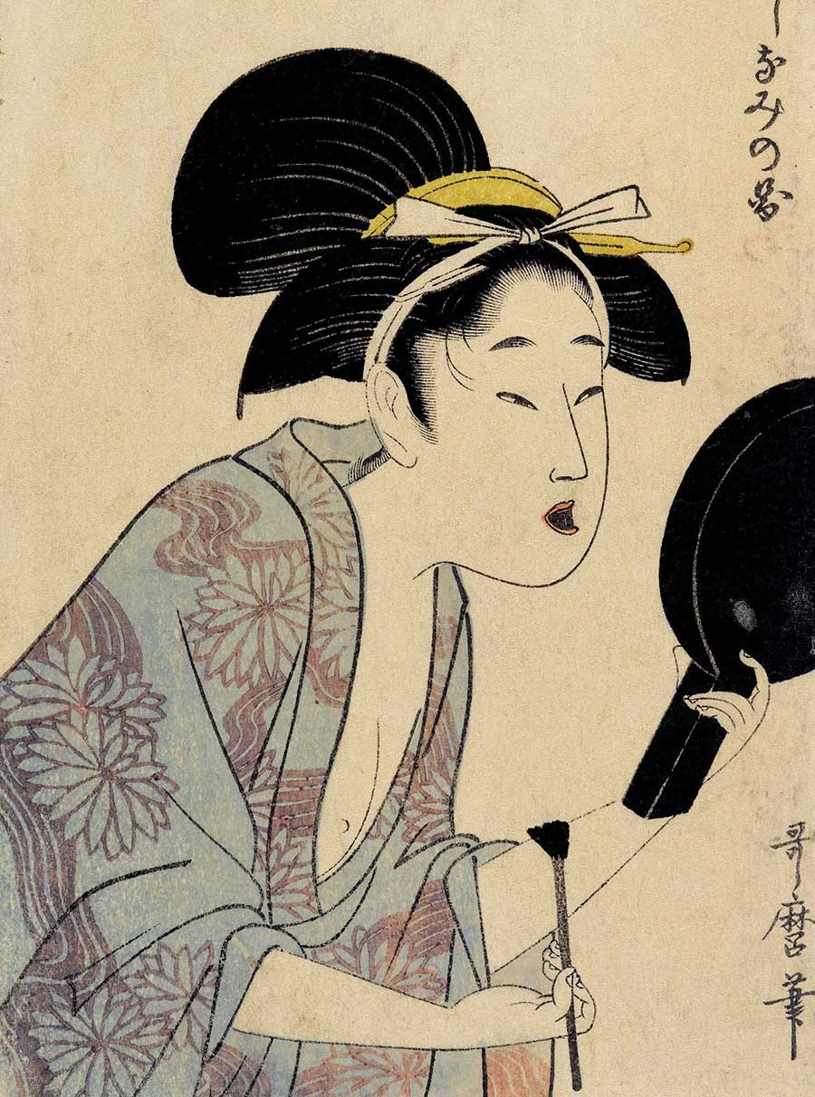 Юная гейша-ученица наносит «бени» (помаду) из чашки, поверхность которой покрыта слоем сухого сафлора. Намокая, он превращался в густо-красную краску. Так «бени» красили губы со времен периода Эдо.