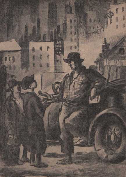 Джонни было не так-то легко держать свой секрет, особенно, когда все ребята кричали ему: «Скэб, скэб! Скэба сын! Скэб, скэб! Скэба сын!» Они гнали его прочь, потому что думали, что он в самом деле сын скэба. Но Джонни знал, что он «союзный». Он знал, что его отец не скэб, что отец — вожак забастовки. И он расхаживал, высоко задрав нос.