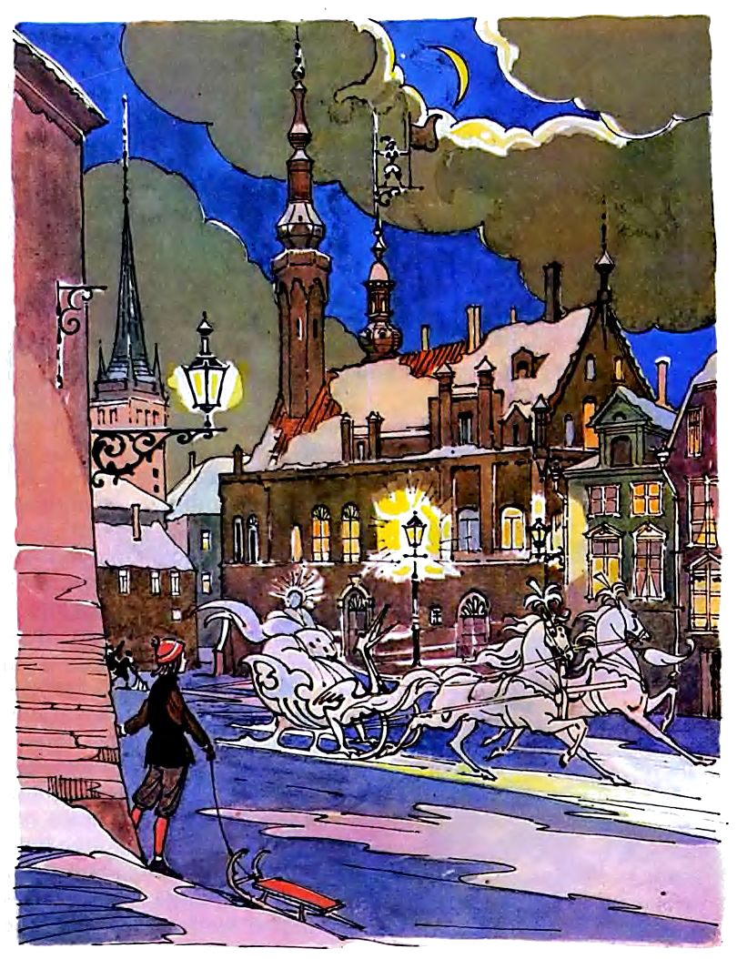 На площади каталось множество детей. Те, что были посмелее, привязывали свои санки к крестьянским саням и прокатывались таким образом довольно далеко. Веселье так и кипело. В самый разгар его на площади появились большие сани, выкрашенные в белый цвет. В них сидел кто-то укутанный в белую меховую шубу и такую же шапку. Сани объехали вокруг площади два раза.