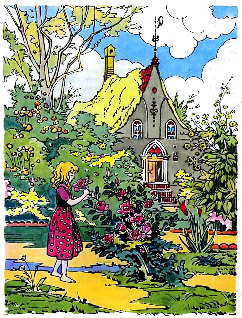 Потом старушка повела Герду в цветник. Тут были цветы всех родов и всех времён года. Во всём свете не нашлось бы книжки с картинками пестрее, красивее этого цветника. Герда прыгала от радости и играла среди цветов, пока солнце не село за высокими вишнёвыми деревьями. Тогда её уложили в чудесную постельку с красными шёлковыми перинками, набитыми голубыми фиалками. Девочка заснула, и ей снились такие сны, какие видит разве королева в день своей свадьбы.