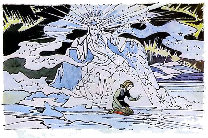 Кай совсем посинел, почти почернел от холода, но не замечал этого — поцелуи Снежной королевы сделали его нечувствительным к холоду, да и самое сердце его было куском льда. Кай возился с плоскими остроконечными льдинами, укладывая их на всевозможные лады. Есть ведь такая игра — складывание фигур из деревянных дощечек, которая называется «китайской головоломкой». Кай тоже складывал разные затейливые фигуры, но из льдин, и это называлось «ледяной игрой разума». В его глазах эти фигуры были чудом искусства, а складывание их — занятием первостепенной важности. Это происходило оттого, что в глазу у него сидел осколок волшебного зеркала. Он складывал из льдин целые слова, но никак не мог сложить того, что ему особенно хотелось, — слово «вечность». Снежная королева сказала ему: «Если ты сложишь это слово, ты будешь сам себе господин, и я подарю тебе весь свет и пару новых коньков». Но он никак не мог его сложить.