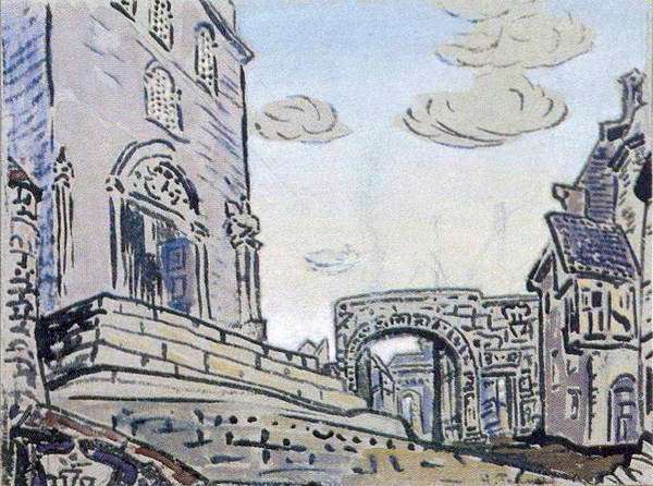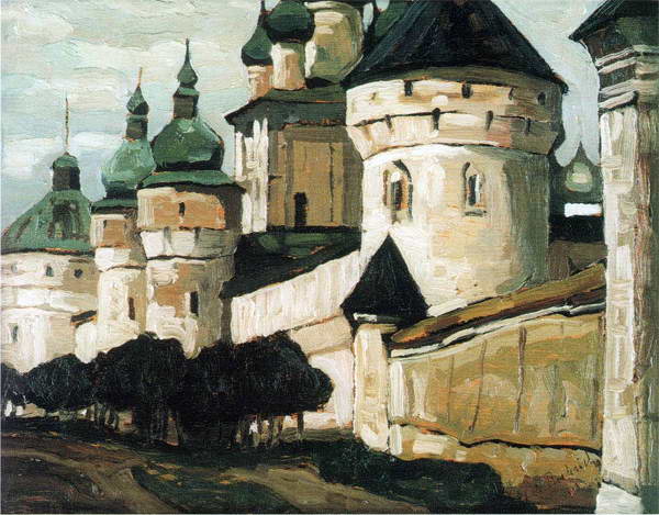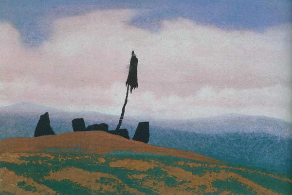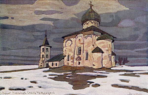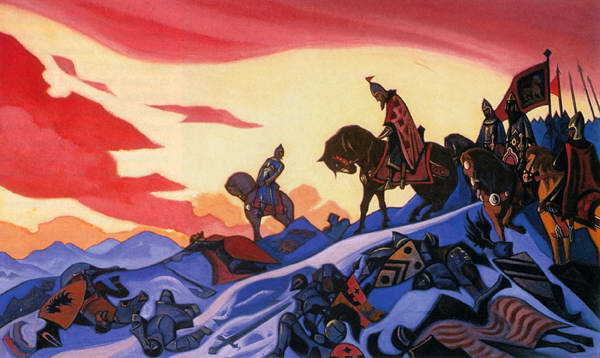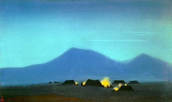Но среди многих записей молодого Рериха такой этюд — исключение. Вероятно, сюжет привлек тем, что относился уже к старине, не к быту, но к былью, — свары современных помещиков и их драматические отношения с вольными крестьянами не привлекают внимания начинающего литератора. В деревнях он бывает нечасто, его притягивают не сельские улицы, не крестьянские труды, но круговорот самой природы, неторопливые и неодолимые смены времен года, единство земли и неба, рек и лесов. Он исхаживает ближние и дальние окрестности «Извары» — под высоким небом, по которому чередой плывут облака, и в их очертаниях видятся всадники, драконы, ангелы, простирающие крылья над спокойной землей.