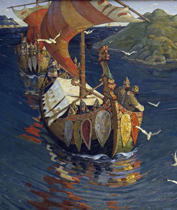 Земляные валы сгоревшего погреба удобно превращать в крепостные валы, брать приступом, размахивая деревянными мечами. Коленька любит эти битвы, засады, оружие; недаром так запомнились золотые «папочные» латы, подаренные дядей. Первый деревянный меч изготовлен еще в Острове — рубил меч головы драконам — серым репейникам, затаившимся в бабушкином саду. С мечом в руках мальчик чувствует себя то ли скандинавским викингом, пришедшим на помощь соседям-русам, то ли самим русским богатырем, какой изображен на обложке детских книжек по истории. Книжки эти — любимое чтение Коленьки Рериха: как все господские дети, он не только резвился в аллеях, но рано начал заниматься грамотой, арифметикой, иностранными языками. И как положено, девятилетнего мальчика определяют в гимназию.