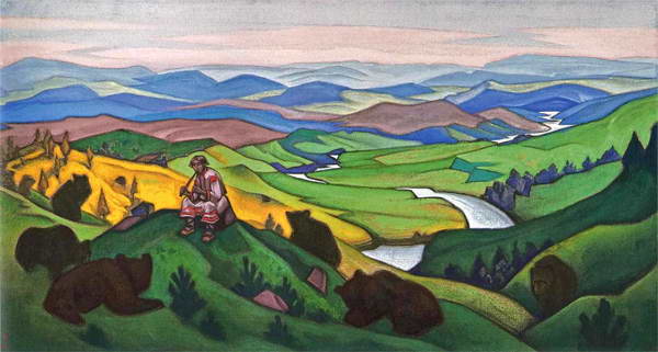 Рерих ближе именно Аксакову, его очеркам-пейзажам, а не тургеневским сценам, в которых непременны крестьянские дети, егеря, лесники с их приметами обитателей жиздринского или болховского уезда, с их заботами, не отпускающими и в лесной чащобе. С явной симпатией относится он к Михайле, но и тот никогда не выходит на первый план, существует в рассказе лишь как собрат — наблюдатель тайной лесной жизни, но не как человек своей, отдельной судьбы.