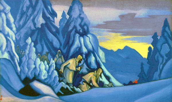 В 1892 году Рерих сочиняет «Зимние картины». Он хочет ввести читателя в зимний лес и сам пристально вглядывается в его оттенки; написал — «синевато-серое небо», зачеркнул, написал — «лиловато-серое». Восходит солнце, розовая заря поднимается над деревьями — это каждый видит, но юноша замечает оттенки, которые увидит не каждый: «Деревья ярко-белые на свету и такие синеватые в тенях мягко выделяются на фоне неба… Дорога серой чертой вьется, извивается по белой равнине. Снежная пыль летит из-под копыт. Бойко бегут мохнатые лошаденки… Господи! Как хорошо в такую минуту!»