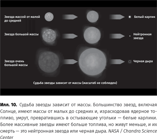Жизнь и смерть звезды зависят от ее массы (илл. 10). Судьбы звезд предопределены с рождения. В зависимости от массы звезды становятся белыми карликами, нейтронными звездами или черными дырами. Не существует «типичной» массы или величины, хотя процесс формирования звезд из неупорядоченных облаков газа порождает гораздо больше мелких звезд, чем крупных. Солнце тяготеет к нижнему краю диапазона масс, под ним располагаются тусклые красные карлики. Красных карликов в несколько сот раз больше, чем солнцеподобных звезд. Продолжительность жизни звезды также зависит от массы, поскольку гравитация определяет температуру ядра, от которой, в свою очередь, зависит скорость протекания термоядерных реакций и, соответственно, временной резерв топлива. Звезда, подобная Солнцу, синтезирует гелий из водорода в течение 10 млрд лет; мы находимся в середине этого периода[58]. Продолжительность жизни звезды в половину солнечной массы – 55 млрд лет, поэтому в истории Вселенной, которой всего 14 млрд лет, еще не умирала ни одна такая звезда. Красный карлик в одну десятую массы Солнца – минимальная масса для звезды, способной осуществлять реакции термоядерного синтеза, – расходует топливо ничтожными порциями. Такая звезда теоретически проживет свыше триллиона лет – и это невообразимо долго. Тем не менее карликовая звезда лишь оттягивает неизбежное, поскольку однажды и она израсходует топливо, тусклый свет погаснет, и гравитация получит свое.
