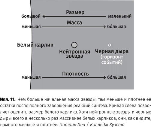 Перед смертью все звезды теряют массу. Как вы помните, прежде чем стать белым карликом, Солнце лишится половины своей массы. Все звезды, начинающие жизнь с массой до 8 солнечных, станут белыми карликами – до 1,4 солнечной массы. Если начальная масса звезды составляет примерно от 8 до 25 солнечных, то коллапс ее ядра продолжается до тех пор, пока все протоны и электроны не сольются в чистое нейтронное вещество[66]. В отсутствие электрической силы нейтроны располагаются плотно, как яйца в картонке. Дальнейшему коллапсу вещества противостоят ядерные и квантовые силы, что не дает белому карлику сжиматься еще больше. Это нейтронная звезда, самая маленькая и плотная звезда во Вселенной. Ее масса превышает 25 солнечных масс. Поприветствуйте потенциальное чудовище Эйнштейна (илл. 11).