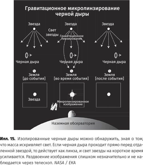 Три эффекта общей теории относительности напрямую соотносятся с ситуациями, когда речь идет о плотной материи, то есть о черных дырах. Первый эффект – отклонение света в соответствии с волнистой структурой пространства-времени, что обусловлено концентрацией массы. Это стало первой и классической проверкой общей теории относительности Эйнштейна в 1919 г., через три года после публикации. Группа под руководством великого английского астрофизика Артура Эддингтона измерила слабое искривление света звезды, проходящего вблизи края диска Солнца. Измерение не было особенно точным, но подтверждение теории относительности сделало Эйнштейна знаменитым и вознесло его на вершины науки. В 1995 г. более точное измерение дало результат, совпавший с предсказанием Эйнштейна с точностью до 0,01 %[17].