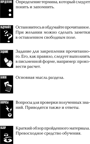 Основные термины и понятия выделены в книге жирным шрифтом: например, базовый. Ключевые моменты текста и задания для лучшего усвоения прочитанного помечены следующими пиктограммами: