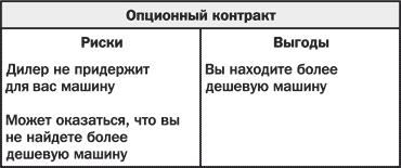 На этот раз вы предлагаете дилеру 100 фунтов за то, что он просто придержит для вас эту машину и не изменит на нее цену. В конце недели эти 100 фунтов перейдут к нему независимо от того, купите вы машину или нет. Предложение соблазнительно, и дилер его принимает. Итак, заключается опционный контракт – в данном случае он называется опционом «колл». Вы получаете право купить автомобиль через неделю без обязательства сделать это.