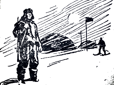 Вспышка факела или луч фонарика выхватывают из темноты то напряженно согнутую фигуру, идущую с ящиком на спине, то покрасневшее лицо с бахромой морозного инея на ресницах и бровях, то целую группу, которая с лямками на плечах, наклонившись против ветра, тащит тяжело нагруженные нарты. Обволакиваясь клубами морозного пара и поблескивая фарами грохочет мотором и тарахтит гусеницами трактор Михайла Комарова, таща на новое место очередной домик. У самого разводья возятся связисты, налаживая телефонную линию с «той стороной». Противоположного «берега» не видно. Только временами луч фонарика выхватывает из темноты кромку причудливо изломанного льда. В двадцати шагах от разводья на вершине радиомачты полощется в порывах ветра алый флаг с серпом и молотом, освещенный бледным светом дежурной электролампочки. Под этим флагом стоит домик советской радиостанции. Отсюда в эфир с гудящей от ветра антенны слетают сигналы, которые несут на материк, в Москву, спокойные слова о том, что помощи нам не нужно, что наблюдения по программе продолжаются и что нет оснований беспокоиться о судьбе станции: коллектив дружен, сплочен и полон уверенности в победе.