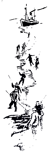 Сурово и в то же время романтично выглядел лагерь в эти дни. Совершенно темная, с черными облаками ночь. Резкий ветер. Поземок, мороз и холод. У разводья заиндевелые, неуклюжие в своей одежде зимовщики с факелами и электрическими фонариками в руках работают упорно и настойчиво, перенося грузы, вытаскивая из начинающего покрываться молодым льдом разводья не успевшее утонуть имущество.