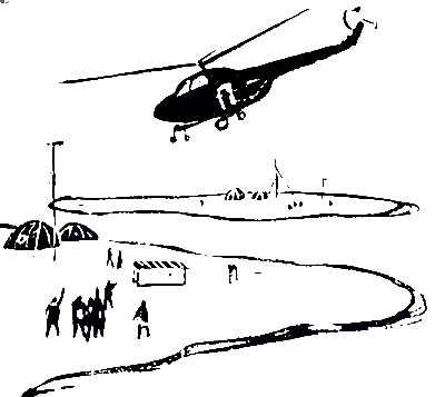 В зеленоватом свете горящей ракеты наша льдина и лагерь были, что называется, как на ладони. Все предметы как бы сдвинулись и стали меньше. Ближайшая гряда торосов четким рисунком ослепительно забелела на фоне горизонта. Вскоре из-за этой гряды показались посадочные фары самолета, и, пройдя почти вплотную над ней летчик мастерски совершил посадку.