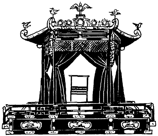 Получается, что земной император уподобляется небесному божественному повелителю. Именно поэтому в императорских указах столь часто употребляется выражение «камунагара» — «являясь божеством». Тронный зал правителя назывался либо «фиолетовым дворцом», либо «Залой Великого Предела» (дайгоку-доно). Понятие Великого Предела (кит. Тайцзи) выражало собой идею предельного состояния бытия, из которого путем последовательного удвоения рождаются женское и мужское начала (инь и ян), а затем и все сущее.