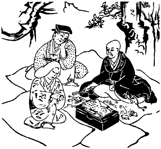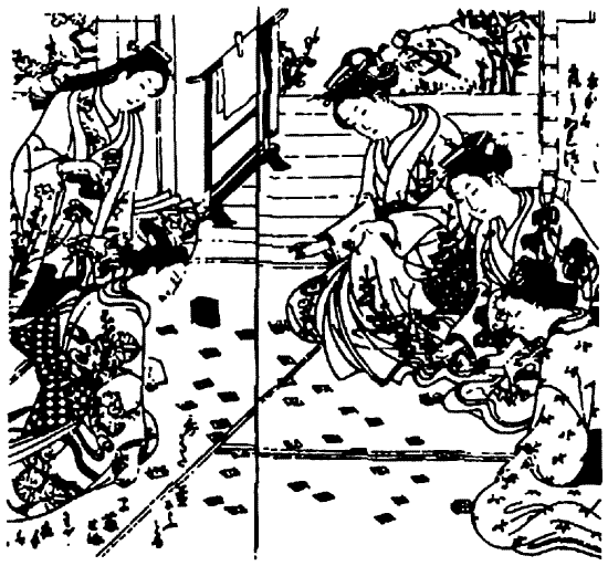 (обратно)Рассказ приводится в сборнике «Цуцуми-тюнагон моногатари». Он фиксирует реалии того времени, когда игра в раковины еще не приобрела своего законченного вида — на створках раковин еще не писали стихов. В рассказе не описывается процесс игры, но из контекста понятно, что речь идет о состязании, в котором побеждает тот, кто предъявит более красивые раковины и оформительские проекты (например, упоминаемый в рассказе макет морского побережья).