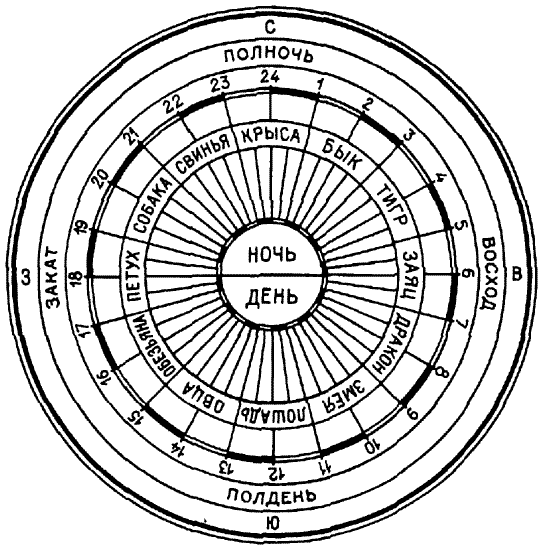 Для китайских пространственных представлений наиболее характерна ориентация по оси север-юг, связанная с тем, что именно на севере небосклона расположено обиталище обожествленной ипостаси первобытной единой субстанции. Именно оттуда, с севера, и происходит управление Поднебесной. Сам же китайский император (земное воплощение Полярной звезды) должен был повелевать Поднебесной, будучи обращен лицом к югу. Но в первых японских письменных памятниках — мифологическо-летописных сводах «Кодзики» («Записи о делах древности», 712 г.) и «Нихон сёки» («Анналы Японии», 720 г.) — наиболее часто указываемыми направлениями являются восток и запад, т. е. основная горизонтальная ось мира проходит именно по этой линии.