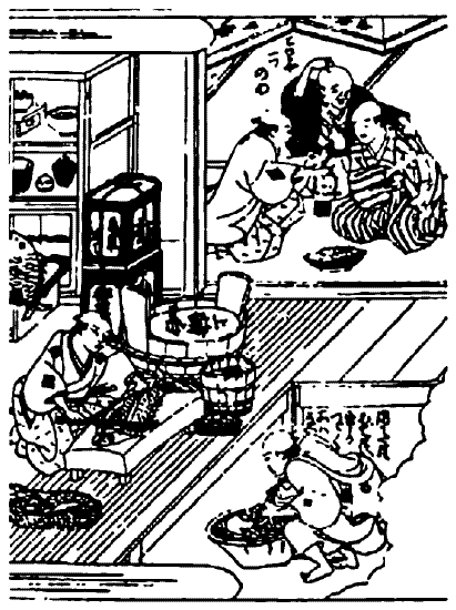 «По обыкновению японцев, сарачинская каша и соленая редька служили нам вместо хлеба и соли. Сверх того, давали нам очень хорошую жареную или вареную рыбу, свежую, а иногда соленую, суп из разной зелени или похлебку, наподобие нашей лапши; часто варили для нас уху или соус с рыбою или похлебку из ракушек. Рыбу жарили в маковом масле и приправляли тертой редькой и соей. Самыми же лучшими кушаньями, по мнению японцев, были китовина и сивучье мясо. Кормили нас, по своему обычаю, три раза в день. Для питья давали теплую или горячую чайную воду, а когда погода была холоднее обыкновенной, давали каждому из нас по две чайных чашки подогретой саке».