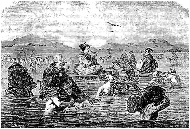 Страшно мучительной казнью считался такой способ медленного и изощренного убийства. Связанного преступника клали на берегу моря у самой кромки воды. Когда накатывала соленая тихоокеанская волна, он начинал захлебываться. Потом волна сходила, и казнимый получал короткую передышку. Считалось, что «нормальным» сроком жизни в таких условиях является восемь дней.