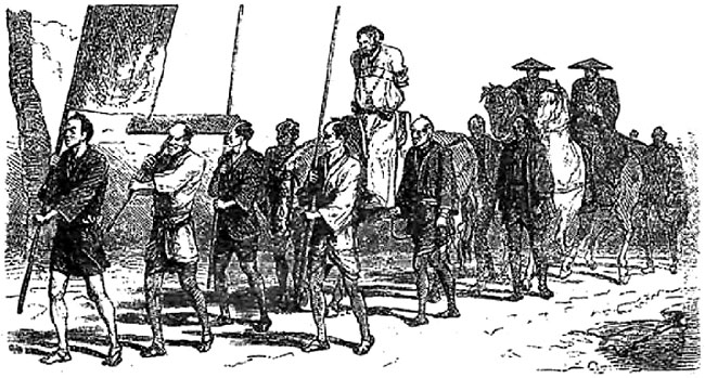 Перед совершением смертной казни осужденного проводили (либо провозили на коне) по городу, причем впереди идущий нес перед собой табличку, надпись на которой разъясняла суть совершенного преступления. Однако наряду с этой процедурой устрашения населения и предания самого преступника позору, ему предоставлялось и право на последнее маленькое желание (и даже не на одно). Сопровождающим его охранникам выделялась определенная сумма денег, которую они использовали согласно указаниям осужденного. Он мог попросить угостить себя лапшой, сакэ или просто утолить жажду. Да мало ли что еще продавали в бесконечных лавках оживленных кварталов, по которым его проводили. Вот только испить молока почему-то все-таки не позволялось. Видимо, считали, что этот дефицитный для Японии продукт — слишком большая роскошь для преступника.