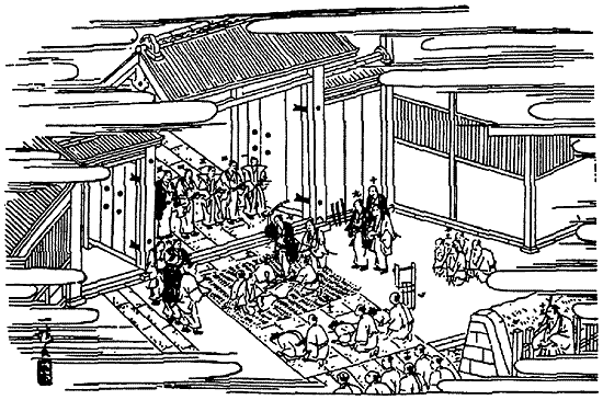 Ну, а что же сама следственная тюрьма? Условия содержания там были вполне чудовищны. Зимой стоял невыносимый холод (камеры не отапливались), летом же — еще более невыносимая духота. Камера была набита людьми, и для самых отверженных жизненное пространство сводилось к минимуму. На восемнадцать человек могла приходиться всего одна циновка (стандартная мера измерения площади, составлявшая чуть больше трех квадратных метров) — спать тогда приходилось по очереди на коленях друг у друга. Спать же днем, естественно, не разрешалось. Для первого предупреждения нарушившего этот запрет надзирателем использовалась вещь, получившая название «метательной подушки». Она представляла собой намоченный водой туго скатанный комок из обрезков материи. Заметив, что кто-то из заключенных задремал, староста, сидевший на возвышении, образованном десятком циновок, без лишних разговоров швырял эту тяжеленную «подушку» в нарушителя тюремного порядка.