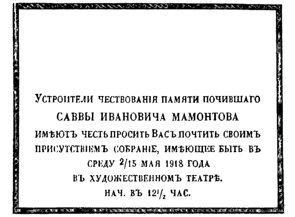 (обратно)Рассказывая об этом эпизоде, племянник Саввы Ивановича, Платон Николаевич Мамонтов, пишет: «Даже много лет спустя дядя Савва не мог спокойно об этом говорить». — ЦГАЛИ, ф. 799, оп. 2, ед. хр. 4, л. 120.
