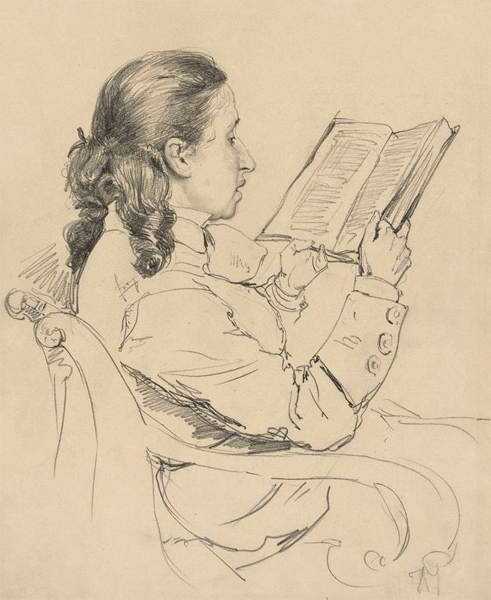 (обратно)Из работ Серова, отражающих события, связанные с первыми годами Мамонтовской оперы, пожалуй, самая интересная та, которую он сделал в 1885 году по приезде из Мюнхена, куда ездил с матерью. Рисунок помечен: «29 августа, Абрамцево. Савва Иванович сидел и переводил „Karmen“».