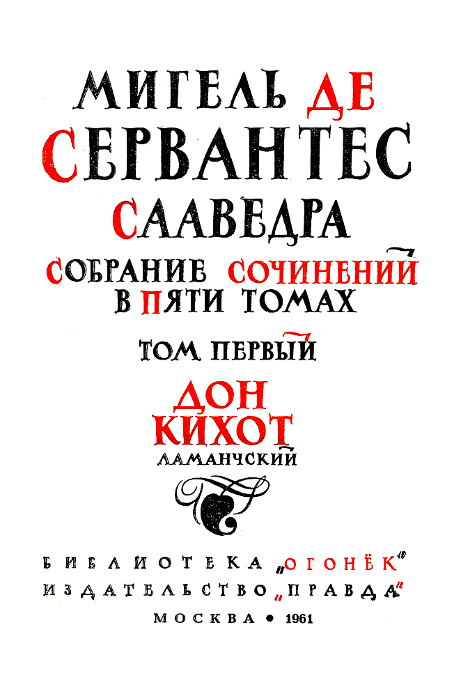 Однако не в мире ином, несуществующем, загробном, встретился он снова со своими друзьями и почитателями: эта встреча произошла в том реальном мире, в котором он жил и творил. Сервантес вечно жив в памяти людей, так же как живы и его бессмертные герои - рыцарь и оруженосец, по-прежнему странствующие в поисках добра, справедливости и красоты по необъятным равнинам своей многострадальной родины. И с особой силой и полнотой эта любовь прогрессивных людей всего мира к гениальному писателю проявляет себя в Советском Союзе, где его книги выходят огромными тиражами на языках нашей многонациональной страны, где его жизнь и творчество являются предметом постоянного любовного изучения. Данью любви и уважения к творчеству Сервантеса является и настоящее издание его лучших произведений - издание, ставящее своею целью дать возможность нашим читателям познакомиться с бессмертным наследством великого гения человечества.