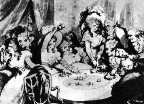 Азартные игры пользовались не меньшей популярностью, чем горячительные напитки. Они наносили такой же ущерб кошельку, как спиртное — здоровью. Вся фешенебельная Англия азартно играла на деньги, и обнаружить свое незнакомство с модной карточной игрой значило уронить себя в глазах света. Аристократы, юристы, врачи, офицеры армии и флота, актеры, политики, даже священники — все они систематически и крупно играли. Играли при дворе, играли в самой захудалой корчме. Вся страна представляла собой один громадный игорный дом.