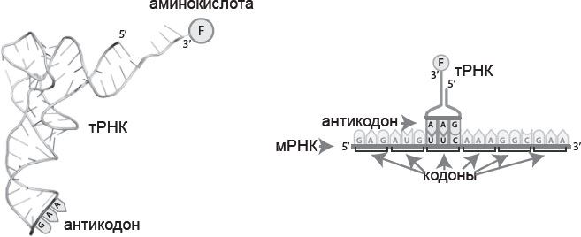 Рис. 2.4. Транспортная РНК: молекулы-адаптеры, подносящие аминокислоты и считывающие код матричной РНК