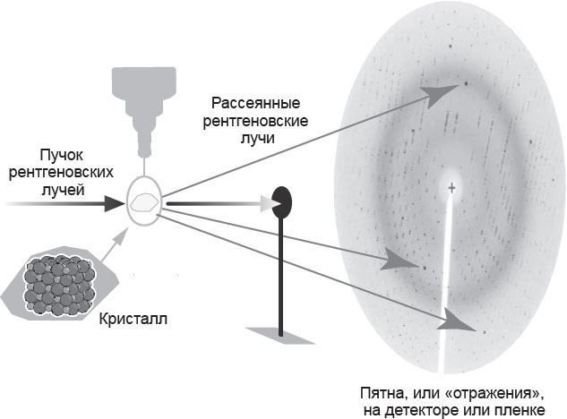 Рис. 3.1. Рентгеновские лучи попадают на кристалл, в результате получаются дифракционные пятна