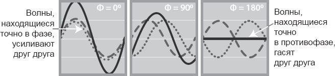 Суммарная сила волны, возникшей из двух волн, зависит от способа их соединения в условиях расположения относительно друг друга. Если пики и впадины у них совпадают, то говорят, что они объединились по фазе, и тогда общая волна будет вдвое сильнее ее слагаемых. Если гребни одной волны накладываются на подошвы другой, то эти волны в противофазе и полностью гасят друг друга. Прочие комбинации дают некий промежуточный результат.