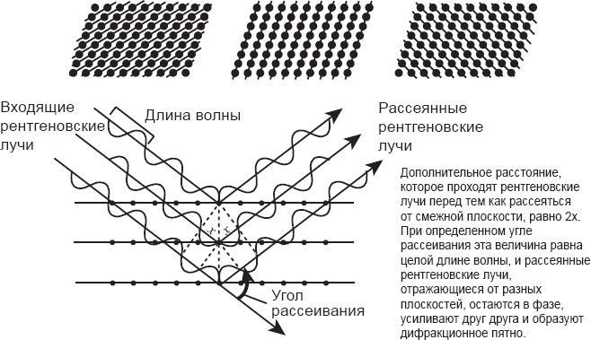 Фон Лауэ быстро догадался, что происходит: кристалл, с которым они работали, имел правильную трехмерную структуру, состоящую из молекул, – пирамидку из идеальных шариков. При попадании рентгеновских лучей на кристалл каждый атом должен был равномерно рассеивать волны во всех направлениях. То же самое происходит, когда мы бросаем камешек в воду. Результирующая волна, раскатывающаяся в любом направлении, должна была быть суммой волн, рассеянных каждым атомом, по которому попали рентгеновские лучи.