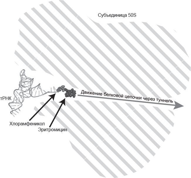 К тому моменту, как я стал работать у Питера, уже были установлены некоторые базовые факты о рибосомах. Каждая рибосома состоит из двух частей: большой и малой субъединиц. Малая субъединица связывается с мРНК, содержащей генетическую информацию, а большая сшивает аминокислоты, подносимые тРНК, и делает из них белок. В рибосоме есть пазы для трех тРНК, одна из которых подносит новую аминокислоту, другая – удерживает растущую белковую цепочку, а третья – выступает в качестве своеобразной перевалочной базы, куда белки попадают перед выходом из рибосомы. И тРНК движутся по рибосоме от одного паза к следующему. В сущности, они протаскивают мРНК вслед за собой, и сама рибосома фактически движется вдоль мРНК, помогая тРНК считывать кодон за кодоном при синтезе белка. Прохождение каждого этапа требует энергии, поэтому рибосому часто называют молекулярной машиной, или наномашиной.