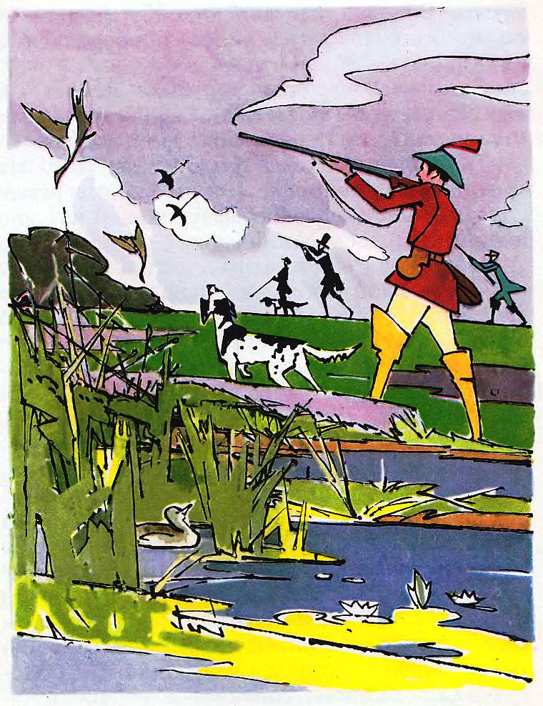 Пиф-паф! – раздалось вдруг над болотом, и гусаки замертво рухнули в камыши, а вода окрасилась кровью. Пиф-паф! – раздалось опять, и из камышей поднялась целая стая диких гусей. Пальба разгорелась. Охотники оцепили всё болото, некоторые укрылись в ветвях нависших над ним деревьев. Клубы голубого дыма окутывали деревья и стлались над водой. По болоту шлёпали охотничьи собаки и, пробиваясь сквозь камыш, раскачивали его из стороны в сторону.