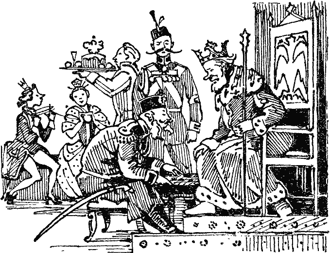 Царь. (снимая корону). Ну, ты, придержи язык, пока голова на плечах!.. А что до табакерки касается, так тут у меня, господа, такая история вышла… Помнится, солдат этот у меня в коридоре на карауле стоял. Ну, я вздумал, скуки ради, подшутить над ним. Взял да и пожаловал ему золотую табакерку, а для смеху пятак с него взял…