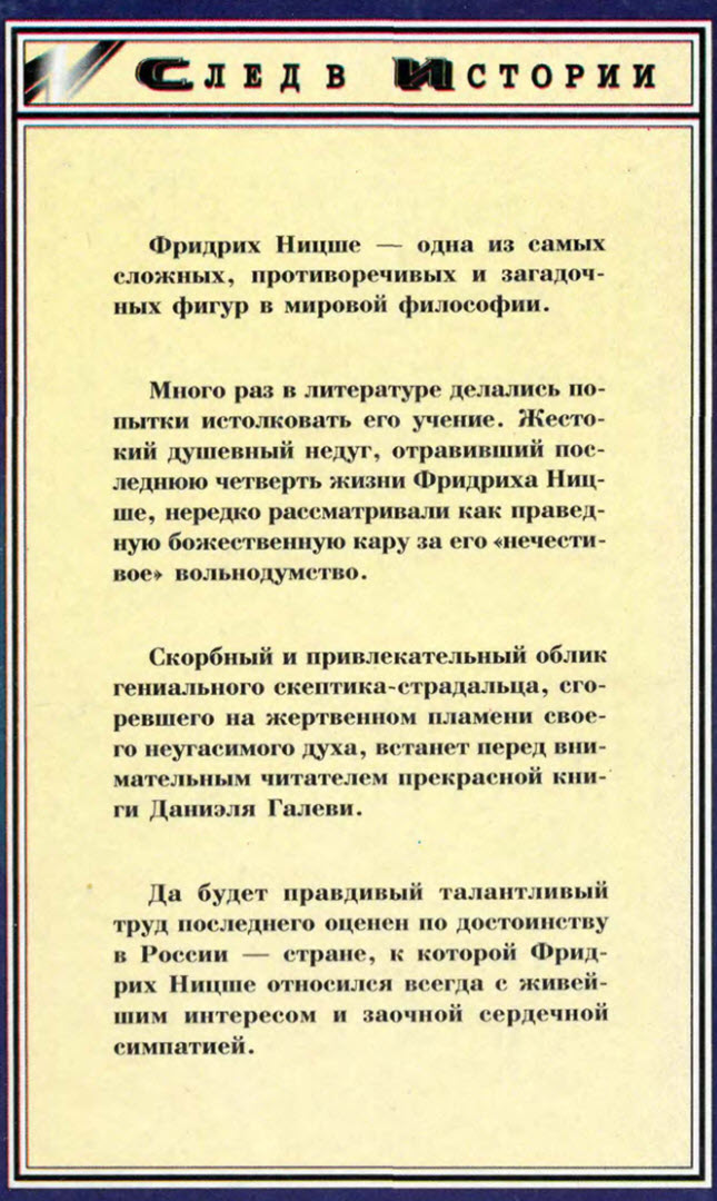 Да будет правдивый талантливый труд последнего оценен но достоинству в России — стране, к которой Фридрих Ницше относился всегда с живейшим интересом и заочной сердечной симпатией.