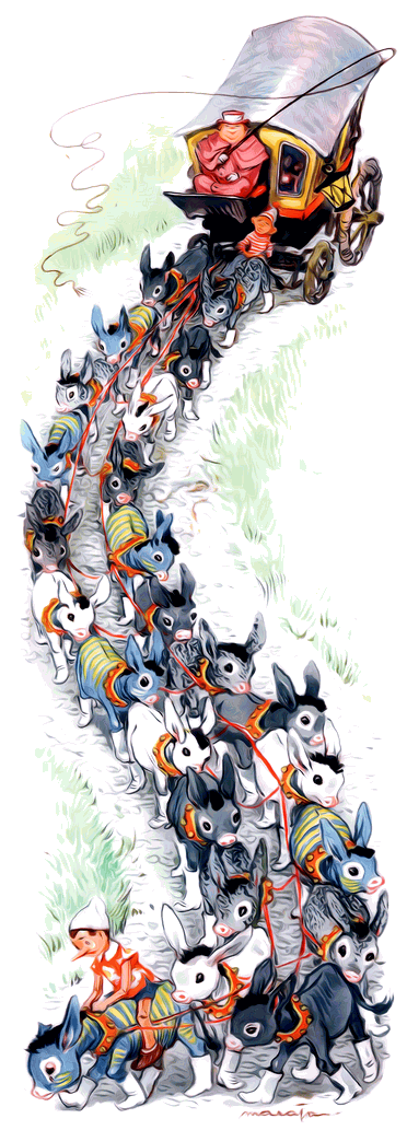 Пиноккио вошёл в стойло и увидел вытянувшегося на соломе ослика, изнемогшего от непосильного труда. Вглядевшись в ослика повнимательней, он с тревогой сказал себе: «Похоже, я его знаю! Мне знаком этот ослик!» И, наклонившись поближе, Пиноккио спросил на ослином языке: