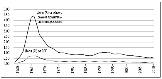 (обратно)Источники: Отдел управления и бюджета (Office of Management and Budget), архивные таблицы 1.1 (расходы федерального правительства) и 4.1 (расходы НАСА в 1962–2010 гг.), выпуск за апрель 2011 г.; Сводка архивных данных НАСА (NASA Historical Data Book) за 1958–1968 годы, том 1: ресурсы НАСА (расходы НАСА в 1959–1961 гг.); Бюро экономического анализа (Bureau of Economic Analysis) – данные о ВВП.