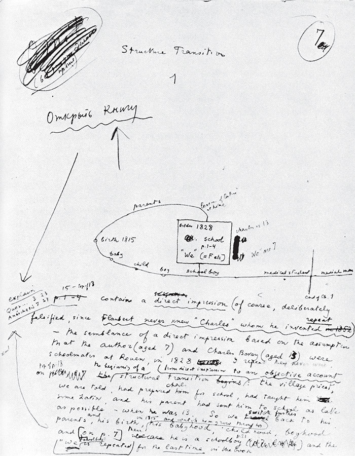 С другой стороны, машинописные страницы могут составлять значительную часть лекции, как это имеет место в случае с «Мэнсфилд-парком», но более всего – в разделе о «Госпоже Бовари». Бросающийся в глаза контраст между эскизностью, отсутствием отделки рукописного текста (даже когда в нем есть следы правки) и сравнительной гладкостью машинописного заставляет думать, что, печатая фрагменты лекций мужа, госпожа Набокова могла свободно принимать те редакторские решения, которые шли на пользу процессу публичного чтения. Это оставляло Набокову возможность впоследствии перерабатывать те или иные страницы машинописи, добавляя новые комментарии или исправляя неудачные фразы.