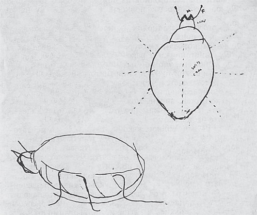 (обратно)В рабочем экземпляре «Превращения» с пометками В. Н.: «Обычный жук не имеет век и не может закрыть глаза – жук с человеческими глазами». Об отрывке в целом: «В немецком оригинале чудесный плавный ритм, последовательность фраз, напоминающая сновидение. Он наполовину проснулся – он воспринимает свое состояние без удивления, приемлет по-детски и в то же время цепляется за человеческие воспоминания, за прошлый опыт. Превращение еще не завершилось». – Ф. Б.