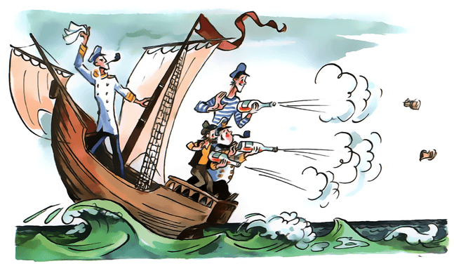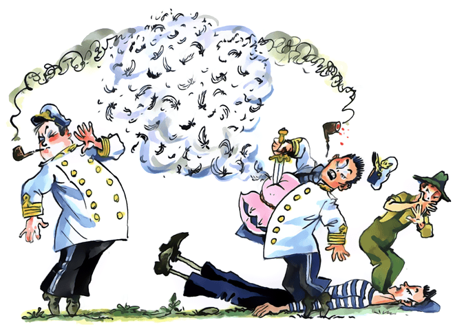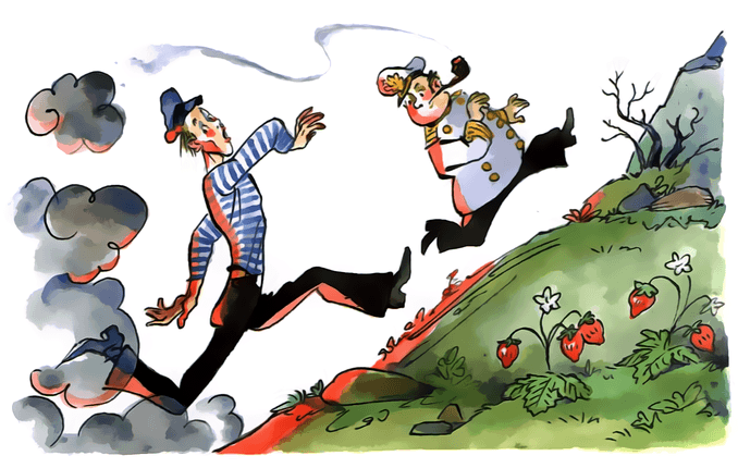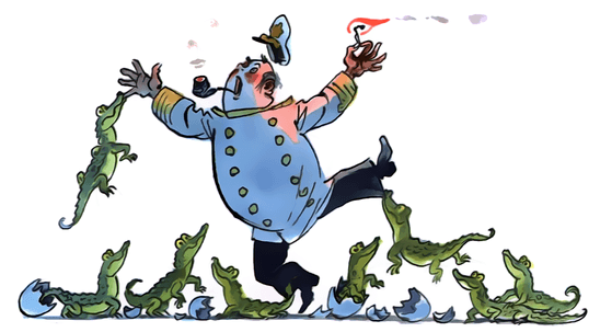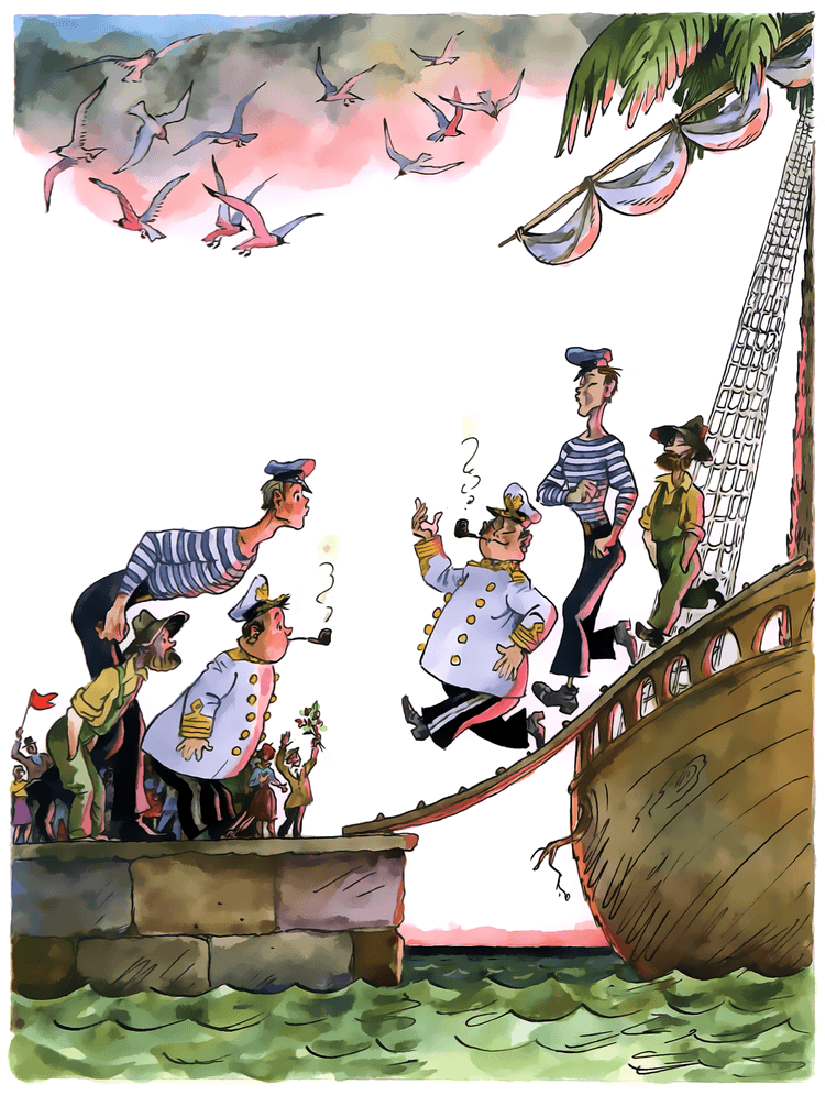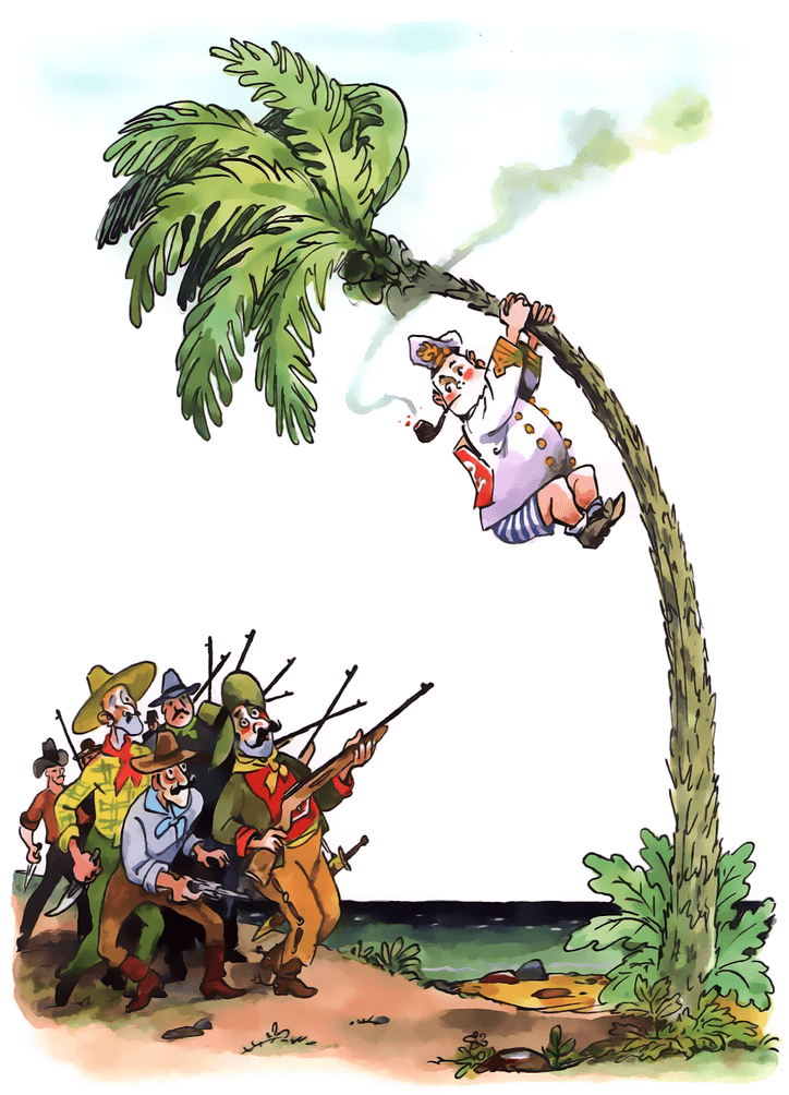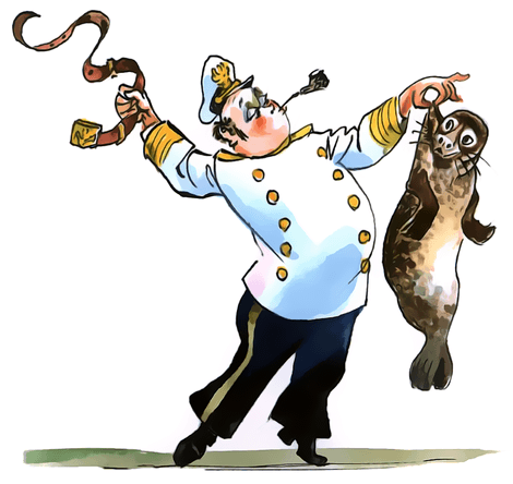 Вместо скромного отставного аптекаря за столом, углубившись в чтение какой-то древней книги, сидел грозный капитан в полной парадной форме, с золотыми нашивками на рукавах. Он свирепо грыз огромную прокуренную трубку, о пенсне и помину не было, а седые, растрепанные волосы клочьями торчали во все стороны. Даже нос, хотя он и действительно покраснел, стал у Врунгеля как-то солиднее и всеми своими движениями выражал решительность и отвагу.