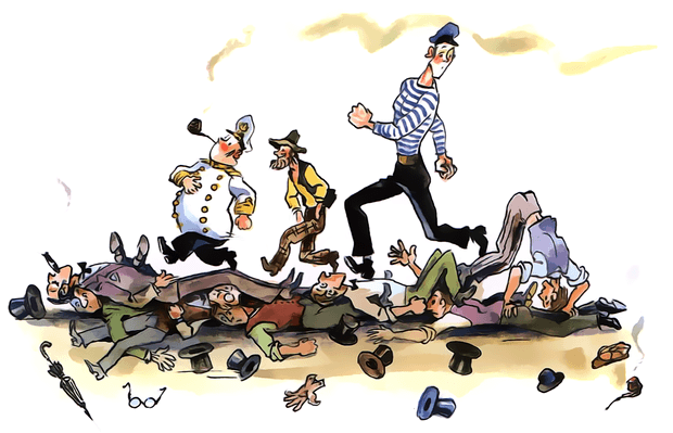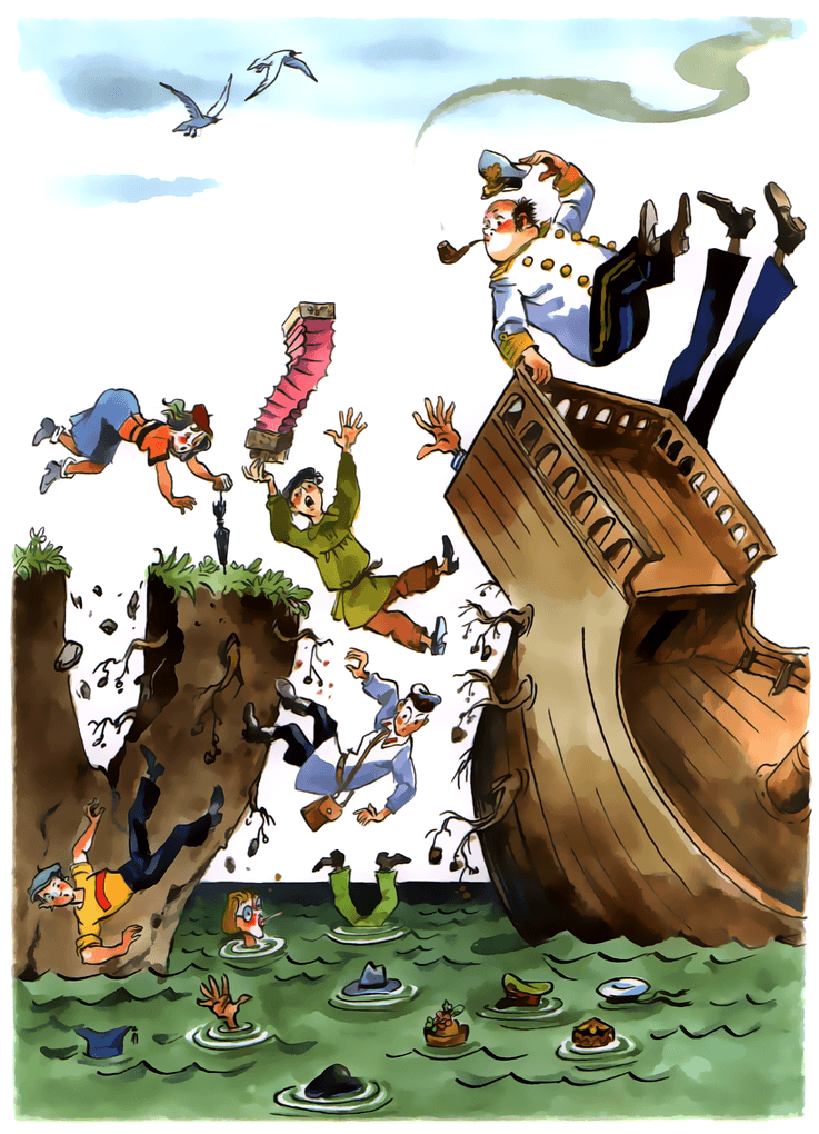 Вдруг что-то ухнуло, яхта накренилась, я на мгновение потерял сознание, а когда очнулся, смотрю — конфигурация берегов резко изменилась, толпы рассеялись, вода кишит головными уборами, тут же плавает будка с мороженым, верхом на ней сидит молодой человек с киноаппаратом и крутит ручку.