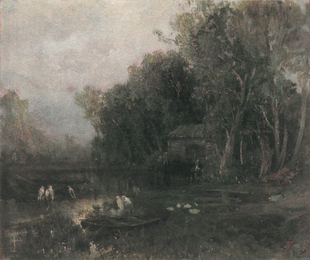 Зеркальная поверхность глухого, зарастающего трясиной пруда мерцает холодным светом. В тихой воде задумчиво стоят цапли. Около топкого берега полузатонувшая лодка, покрытая серебристой плесенью. У дальнего берега, среди исполинских деревьев, стоит ветхая, давно покинутая водяная мельница. Ее замшелые стены окутаны сизо-зеленой пеленой болотного тумана. Из тумана призрачно выступает лес, над которым небо переливается тонкими переходами жемчужно-серых тонов.