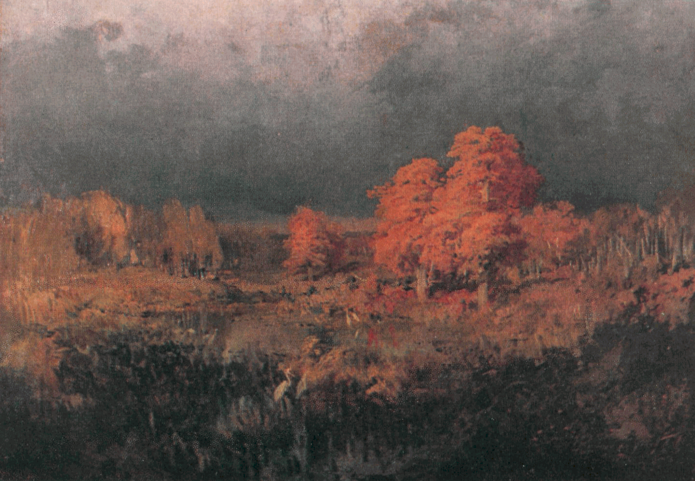 В картине есть места поразительные по красоте и изысканности цветовых отношений. Неподражаемо, например, выдержано отношение пепельно-серебристых с теплыми бликами цапель к приглушенной изумрудной зелени и к воде около них. Великолепно написана вода, местами светлая и прозрачная, местами темная и зеркальная, в которой четко отражаются деревья. Здесь и серебристые, и зеленоватые, и бурые, и жемчужные, и почти черные тона и оттенки. Хорошо взято отношение богатого утонченными цветовыми переходами неба к зелени леса.