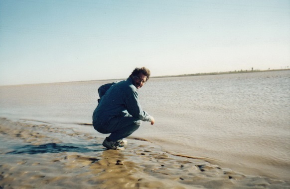 Действительно река была не очень далеко от города. Сначала мы проехали мимо бескрайних полей с «гусями» нефтеразработок. Потом добрались до большого вантового моста и увидели широкий мутный поток между двух вязких от мокрой глины берегов. Нам с трудом удалось найти более-менее безопасный подход к самой воде.