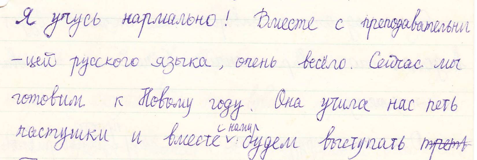 Когда вы учили меня правильному произношению, я даже боялась открыть рот, но ваши слова «Если вы хотите научиться плавать, то обязательно нужно прыгать в воду» вдохновили меня. Эти слова звучат в моих ушах до сих пор. Я мечтаю о том, что когда-нибудь наступит тот день, когда я смогу поехать в Россию. И хотя я не знаю, смогу ли я когда-нибудь осуществить свою мечту, но я для этого приложу все усилия, чтобы выучить русский язык.